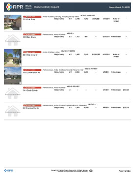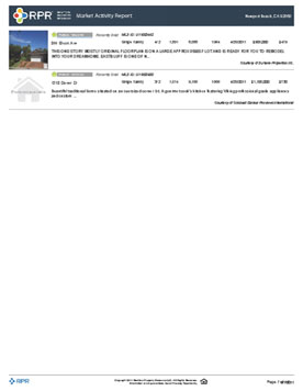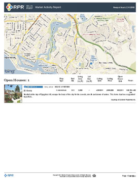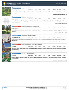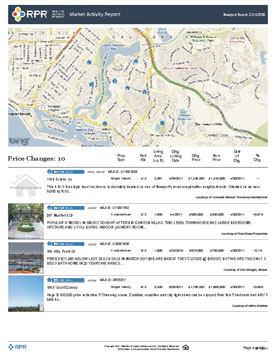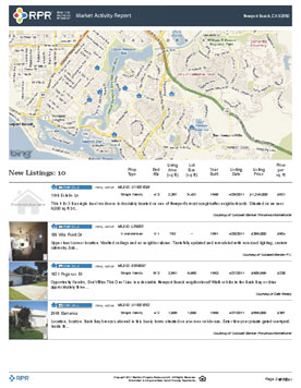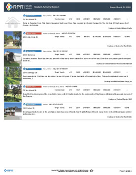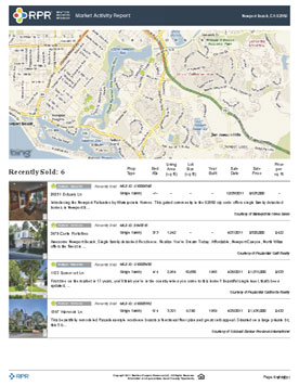The Market Activity Report is a snapshot of all the changes in a local real estate market. It includes a market activity summary and a listing of active, pending, sold, expired and distressed properties. Recent price changes and upcoming open houses are also included. The Market Activity Report provides an excellent report of what’s going on in our local real estate market based on the most up-to-date data available exclusively to REALTORS®.
